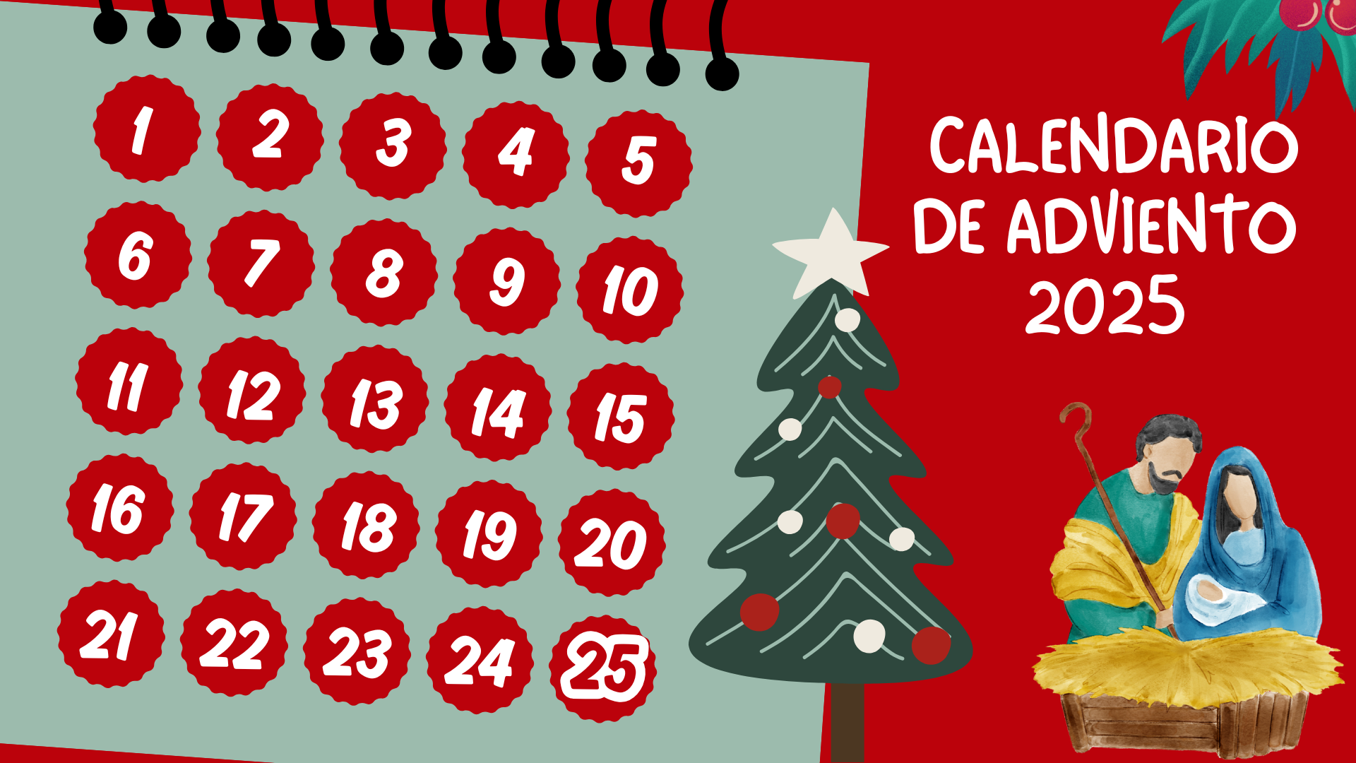 VARIOS 26 Nov 2025 ParroquiaSPF CALENDARIO DE ADVIENTO 2025 ¿Te quieres preparar para la Navidad? El fin de este calendario es recuperar el verdadero significado de la Navidad, en la que vamos a celebrar el nacimiento de Jesús. Abre cada día la casilla que corresponde y anímate a cumplir con su propósito.Este año podrás enviárnoslos y serán publicados en la Página Web. CALENDARIO DE ADVIENTO